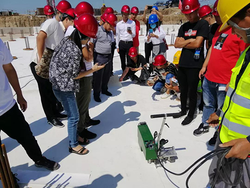 在隨后的項目參觀中,合伙人通過參與熱風(fēng)焊接TPO卷材性能的講解、實操等環(huán)節(jié),了解東方雨虹的產(chǎn)品和工法,以及如何提升工程質(zhì)量、有效縮短工期。