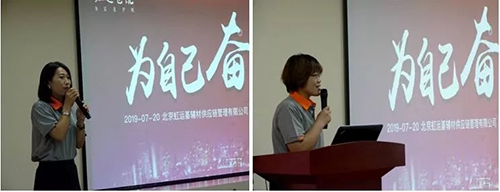 員工代表郝小紅女士、耿俊芳女士相繼發言,她們表示,愿充分發揮主人翁意識,從我做起、忘我拼搏,不拋棄、不放棄,堅定不移與虹運共同成長。