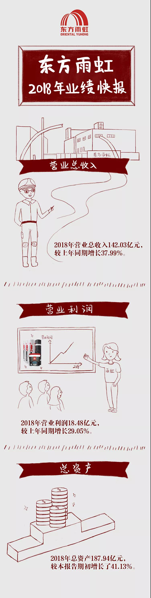 2月25日,東方雨虹公告2018年度業(yè)績快報。 報告期內,公司實現(xiàn)營業(yè)總收入142.03億元,較上年同期增長37.99%,主要系隨著公司品牌影響力不斷提升,產(chǎn)品銷量同比增長,材料銷售業(yè)務和施工服務業(yè)務規(guī)模均有所增長所致;營業(yè)利潤18.48億元,較上年同期增長29.05%;利潤總額18.52億元,較上年同期增長28.91%;歸屬于上市公司股東的凈利潤15.18億元,較上年同期增長22.54%;基本每股收益1.01元,較上年同期增長21.69%,主要原因是報告期公司營業(yè)狀況整體向好,主要產(chǎn)品的銷售收入、施工收入繼續(xù)增加,毛利潤逐步提高所致。 報告期公司財務狀況良好,截至2018年12月31日,公司總資產(chǎn)187.94億元,較本報告期初增長了41.13%,主要是公司經(jīng)營規(guī)模擴大所致。