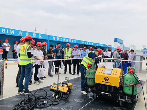 期間,東方雨虹的技術人員現場展示了常用防水產品、維修專用TPO、防水系統模型等,重點介紹了“虹人坦途”智能型熱熔防水卷材攤鋪機車,并現場烘烤防水卷材,展示了優秀的建筑防水滿粘工藝及其施工效果,使得與會人員更加直觀認識“虹人坦途”攤鋪機車的優異性能和有效運用。