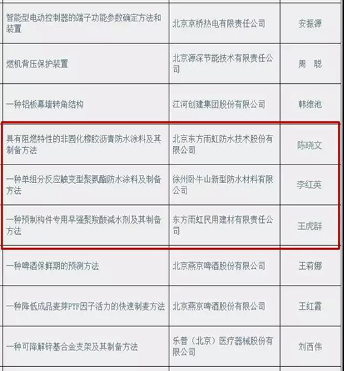 其中北京東方雨虹防水技術(shù)股份有限公司段文鋒工作室的“特種非固化橡膠瀝青防水涂料”獲得創(chuàng)新項(xiàng)目助推;北京東方雨虹防水技術(shù)有限公司的“具有阻燃特性的非固化橡膠瀝青防水涂料及其制備方法”、東方雨虹民用建材有限責(zé)任公司的“一種預(yù)制構(gòu)件專用早強(qiáng)聚羧酸減水劑及其制備方法”、徐州臥牛山新型防水材料有限公司的“一種單組分反應(yīng)觸變型聚氨酯防水涂料”獲得創(chuàng)新發(fā)明專利助推。