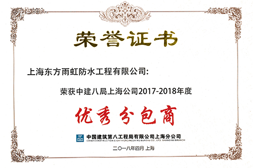 4月1日,由中國建筑第八工程局有限公司上海公司舉辦的2018年“攜手共進,誠信共贏“分供商會議在中建八局上海公司總部舉行。會上,中建八局上海公司對在2017年有作出重要貢獻的合作企業(yè)進行表彰。上海東方雨虹獲評“2017-2018年度優(yōu)秀分包商”殊榮。