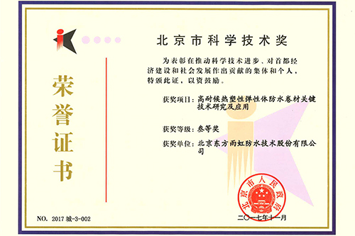 2月5日,北京市科學技術獎勵大會在北京召開。東方雨虹“高耐候熱塑性彈性體防水卷材關鍵技術研究及應用”項目榮獲北京市科學技術獎三等獎。北京市委書記蔡奇,市委副書記、市長陳吉寧為獲獎項目頒獎。