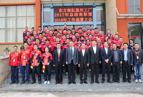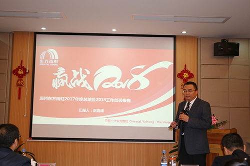 1月20日,東方雨虹惠州生產(chǎn)基地全體員工歡聚一堂,在基地綜合樓會議室隆重召開2017年度總結(jié)表彰暨2018年工作部署大會。東方雨虹集團(tuán)生產(chǎn)運營總監(jiān)陸殿富先生、副總監(jiān)劉金景先生、東方雨虹民建(廣州)公司總經(jīng)理陳詠銓先生等出席了本次大會。