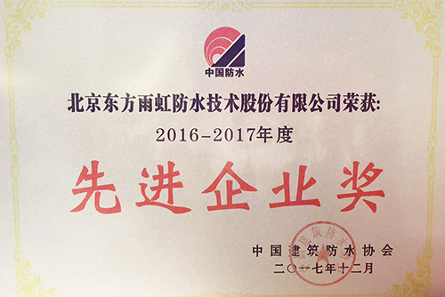 大會還頒發了“2016-2017年度建筑防水行業先進企業獎”。東方雨虹憑借在經營質量、卓越的績效管理和先進的科學技術等方面的示范作用獲得該項殊榮。
