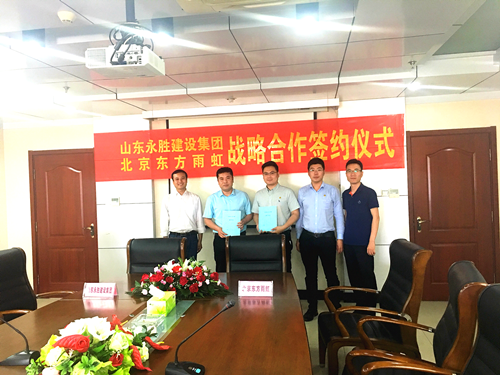 5月26日上午,山東永勝集團與東方雨虹達成戰略合作,簽約儀式在永勝集團總部重大事項會議室順利進行。永勝集團副總經理劉桂洋,東方雨虹工渠事業部魯南省區總經理冷宇超、濟寧城市經理辛漢磊、公司合伙人陳燕華代表雙方簽訂戰略合作協議。
