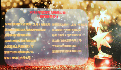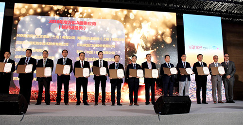 2月17日,萬科集團2017年合作伙伴春茗會在深圳大梅沙萬科總部召開,東方雨虹防水集團總裁劉斌、大客戶事業部總經理陳欣剛參加了此次會議。會上,萬科對外發布了“2016年合格供應商名錄”,在965家五大類合格供應商中,東方雨虹等117家合作企業被評為“A級供應商”。據悉,從2013年萬科開始發布該名錄起,這已是東方雨虹連續第四年榮獲此稱號。