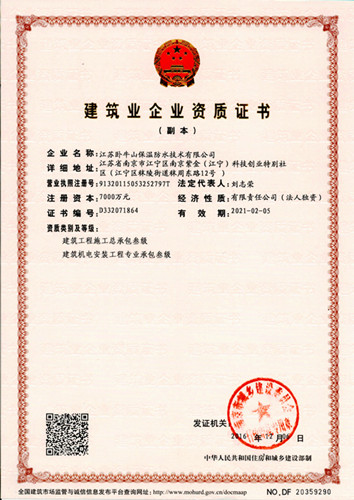 【江蘇臥牛山順利獲得“建筑工程施工總承包三級資質”】 2016年12月,經國家住房和城鄉建設部審核批準,公司順利獲得建筑工程施工總承包三級資質,這是公司繼防水防腐保溫工程專業承包一級資質、建筑裝修裝飾工程專業承包二級資質、建筑幕墻工程專業承包二級資質及建筑機電安裝工程專業承包三級資質后又一重要資質的獲得。