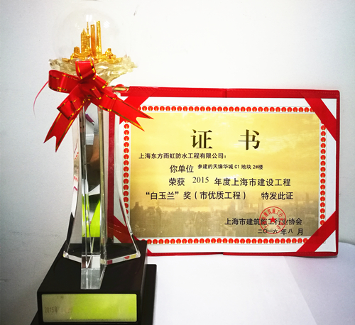 8月,上海東方雨虹參建的天緣華城C1地塊1#樓、2#樓榮獲2015年度上海市建設(shè)工程“白玉蘭”獎(jiǎng)(市優(yōu)質(zhì)工程)榮譽(yù)稱號(hào)。 上海市建設(shè)工程“白玉蘭”獎(jiǎng)是由上海市建筑施工行業(yè)協(xié)會(huì)頒發(fā),旨在促進(jìn)上海建筑業(yè)誠(chéng)信建設(shè),提升上海市建設(shè)工程質(zhì)量水平,提高企業(yè)市場(chǎng)競(jìng)爭(zhēng)力和品牌影響力,同時(shí)也培養(yǎng)了一批批能工巧匠和優(yōu)秀項(xiàng)目管理人才,錘煉了一支支素質(zhì)優(yōu)良的施工隊(duì)伍,推動(dòng)了上海建筑業(yè)的健康發(fā)展。 2010年至今,上海東方雨虹參建的白玉蘭項(xiàng)目已達(dá)40余個(gè),此次獲獎(jiǎng)的天緣華城項(xiàng)目位于上海市祁連山路,上大板塊,地理位置優(yōu)越,是由大華集團(tuán)投資建設(shè)。上海東方雨虹作為大華集團(tuán)防水供應(yīng)商,已與大華集團(tuán)合作十余年之久。此項(xiàng)殊榮不僅使上海東方雨虹區(qū)域品牌形象得到進(jìn)一步提升,擴(kuò)大了公司在華東市場(chǎng)的影響力,更是雙方合作共贏的體現(xiàn),為雙方更深入的合作奠定了堅(jiān)實(shí)的基礎(chǔ)。 上海東方雨虹自成立以來,一直踐行“為人類為社會(huì)創(chuàng)造持久安全的環(huán)境”的企業(yè)使命,致力于“讓老百姓住上不漏水的房子”。東方雨虹不僅專注高品質(zhì)的產(chǎn)品,更專注于為客戶提供系統(tǒng)服務(wù),成為集產(chǎn)品、技術(shù)、服務(wù)和解決方案為一體的全球化防水系統(tǒng)服務(wù)商。在產(chǎn)品質(zhì)量、施工質(zhì)量、服務(wù)質(zhì)量管控方面始終高標(biāo)準(zhǔn)、嚴(yán)要求,堅(jiān)持精益求精,著力打造質(zhì)量?jī)?yōu)質(zhì)工程項(xiàng)目。