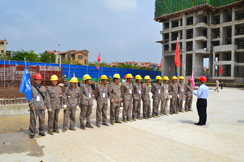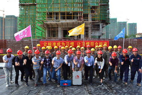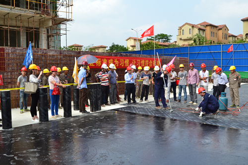 為提高防水工程施工質(zhì)量和施工現(xiàn)場(chǎng)管理水平,解決因施工粗放而導(dǎo)致建筑滲漏率居高不下的問(wèn)題,切實(shí)打造優(yōu)質(zhì)防水工程,東方雨虹決心在全國(guó)推行防水標(biāo)準(zhǔn)化施工服務(wù)體系。4月25日,東方雨虹工程渠道事業(yè)部與南寧東方雨虹防水工程有限公司共同組織舉辦了防水示范工地觀摩交流活動(dòng)----東方雨虹嘉和城白鷺郡南山項(xiàng)目防水標(biāo)準(zhǔn)化施工推介會(huì)。 嘉和城項(xiàng)目施工現(xiàn)場(chǎng)警戒線、標(biāo)示牌、司旗等一應(yīng)俱全,工人們統(tǒng)一著裝,以良好的風(fēng)貌列隊(duì)進(jìn)場(chǎng),嚴(yán)格執(zhí)行標(biāo)準(zhǔn)化施工的要求。