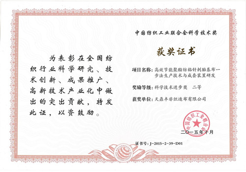 11月24日,“紡織之光”2015年度中國紡織工業聯合會科技教育獎勵大會在北京人民大會堂隆重舉行。會上天鼎豐非織造布有限公司的《高效節能聚酯紡粘針刺胎基布一步法生產技術與成套裝置研發》項目榮獲“紡織之光”2015年中國紡織工業聯合會科技技術進步獎二等獎。