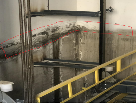 電梯井內(nèi)部金屬構(gòu)件因修飾膨脹,致使金屬構(gòu)件與混凝土間的間隙加大,地下水通過(guò)混凝土間隙滲入電梯井內(nèi)部,造成電梯井內(nèi)部滲水。
